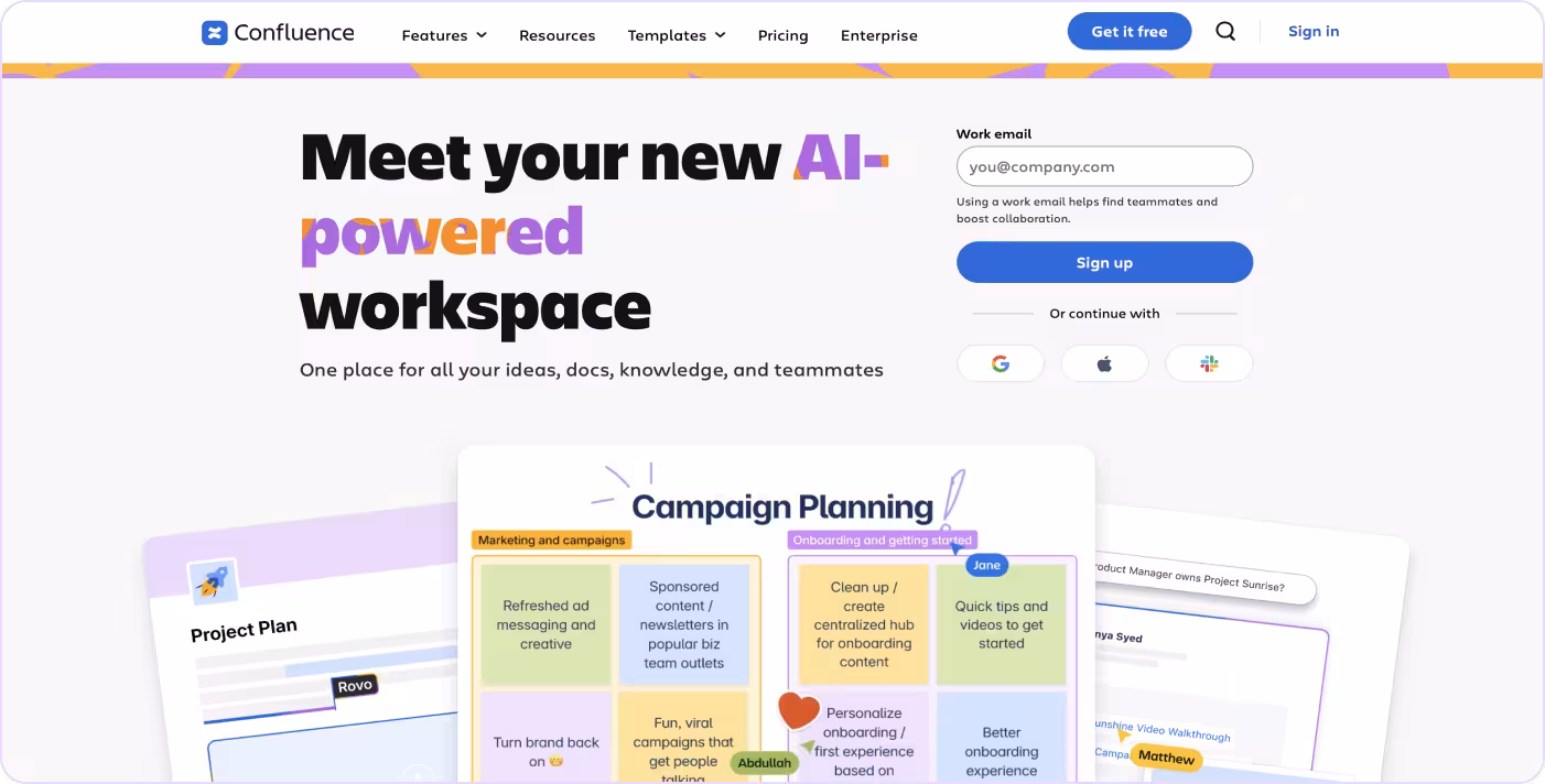 Confluence is Atlassian's team workspace for documentation, knowledge management, and collaboration. Teams use it to create wiki-style pages, organize content into spaces, and centralize project documentation across the organization.