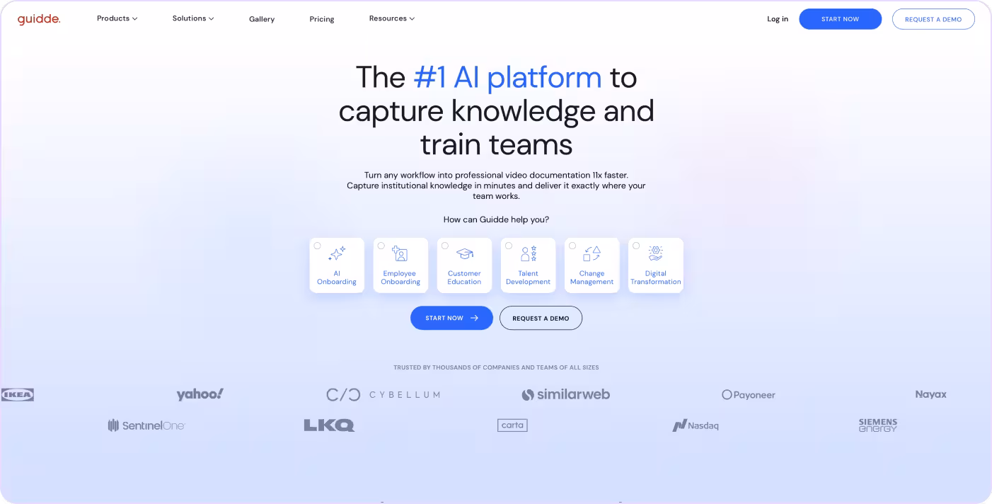 Guidde is a workflow documentation tool that turns processes into AI-generated video tutorials with voiceovers and visual walkthroughs.