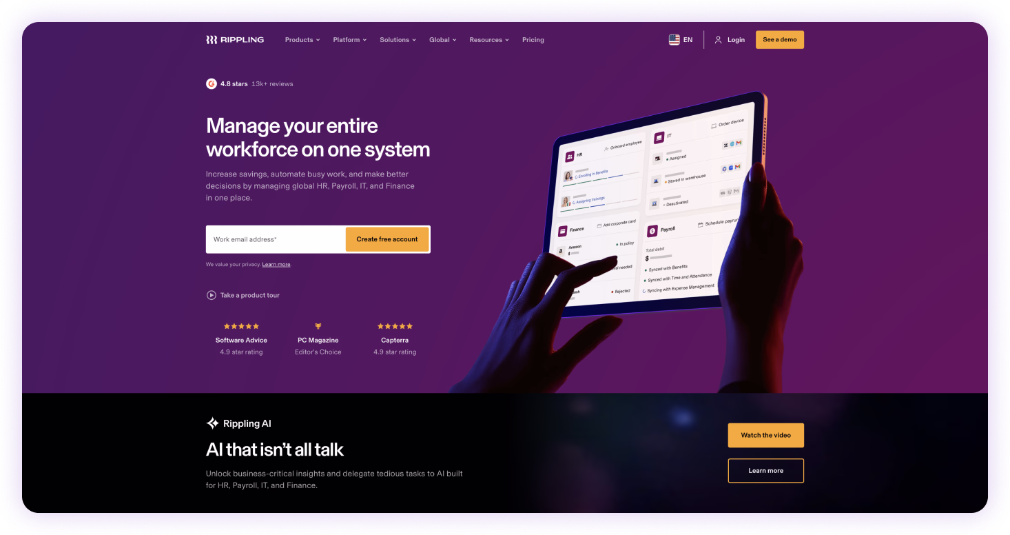 Rippling handles everything that needs to happen behind the scenes when someone joins your company. From payroll to device setup, it automates onboarding across HR and IT in one system.